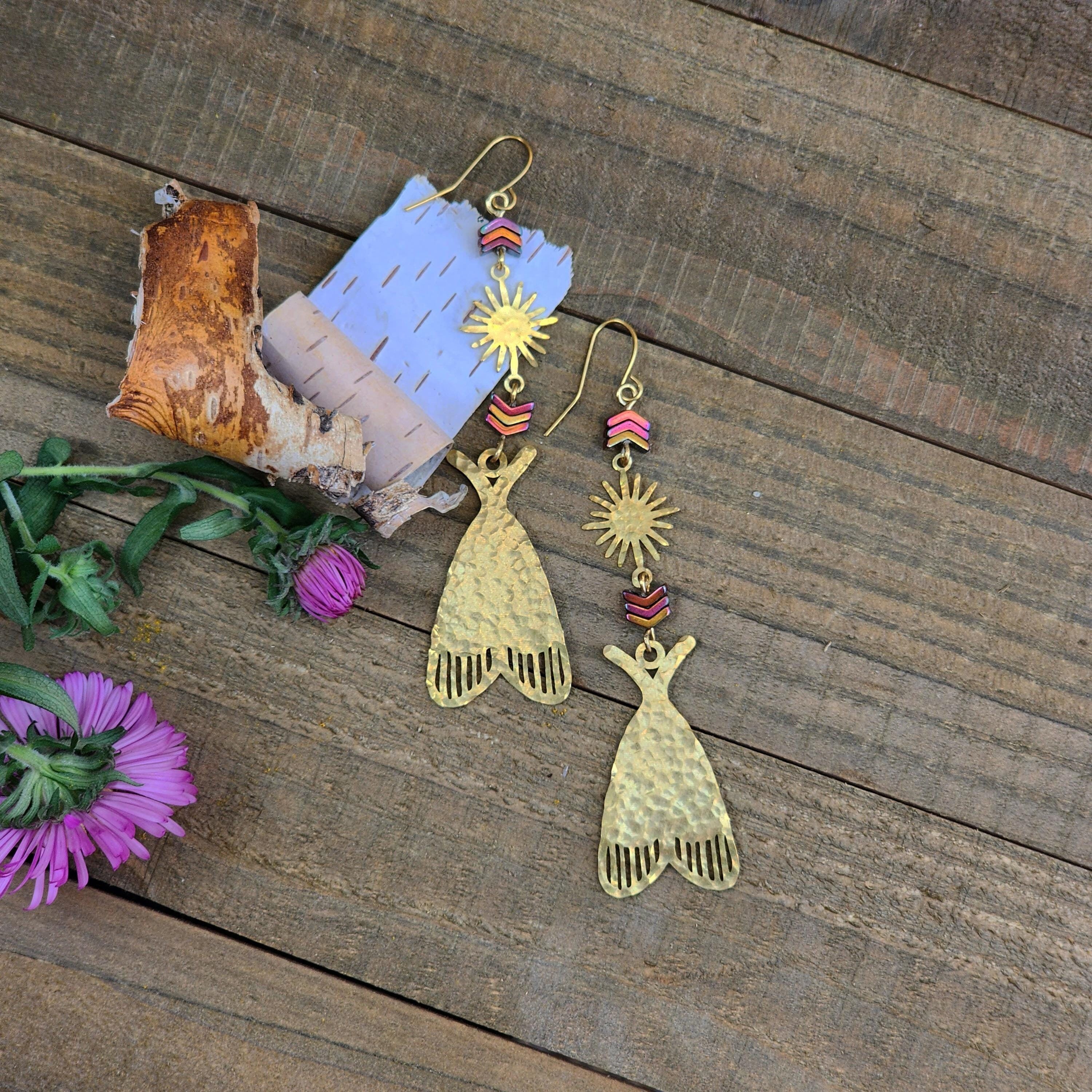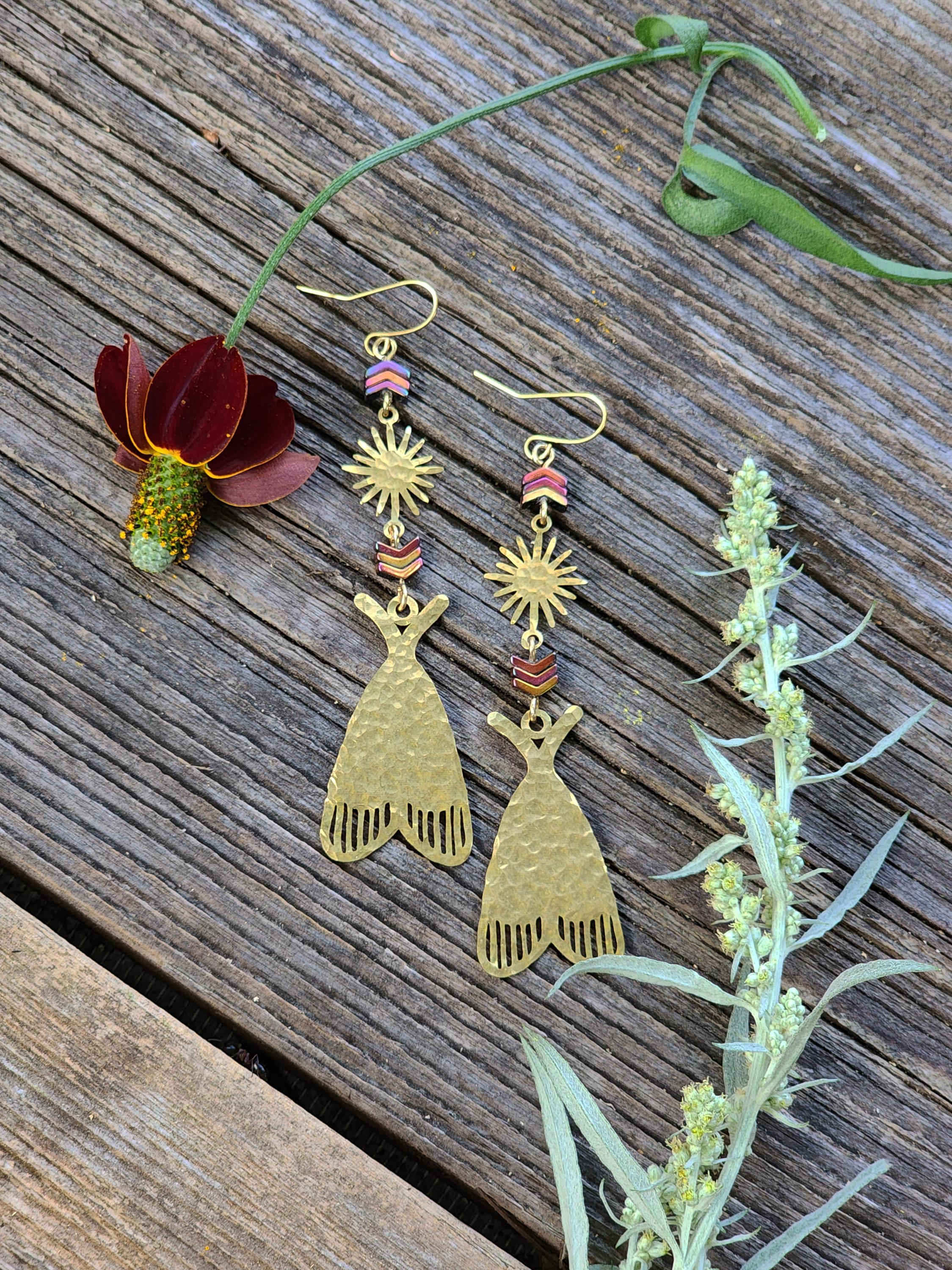 These earrings are designed and made by Ellie Bryan of Black Banjo Arts. These earrings are hammered by hand and assembled from brass components and natural hematite stone beads.