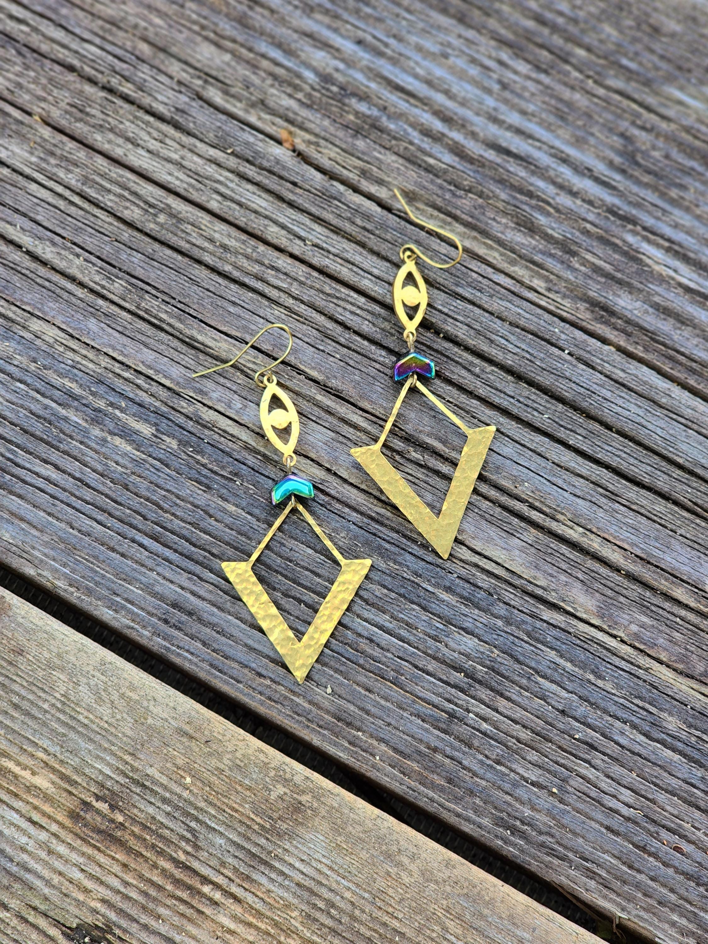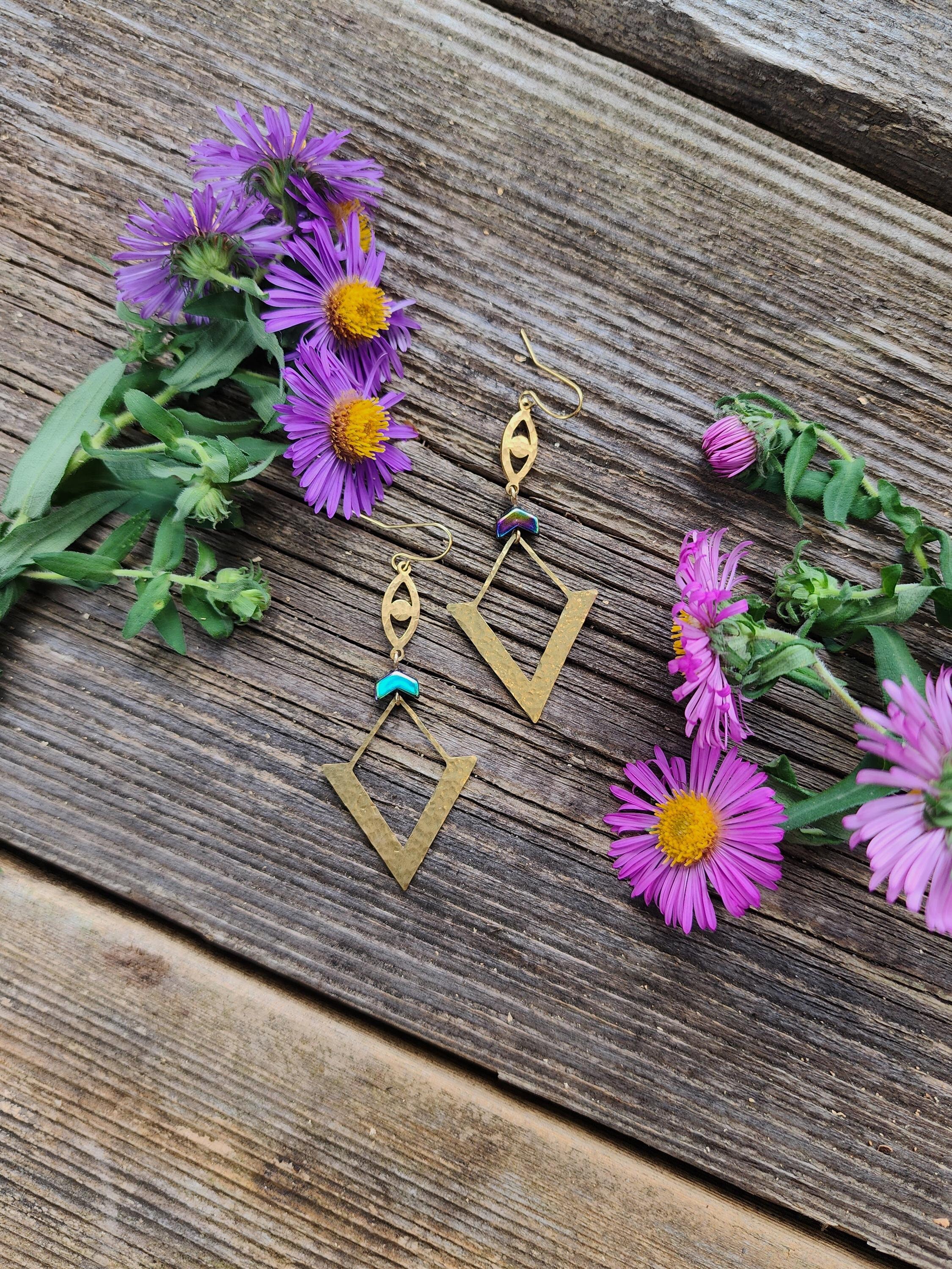 These earrings are designed and made by Ellie Bryan of Black Banjo Arts. These earrings are hammered by hand and assembled from brass components and Hematite beads.