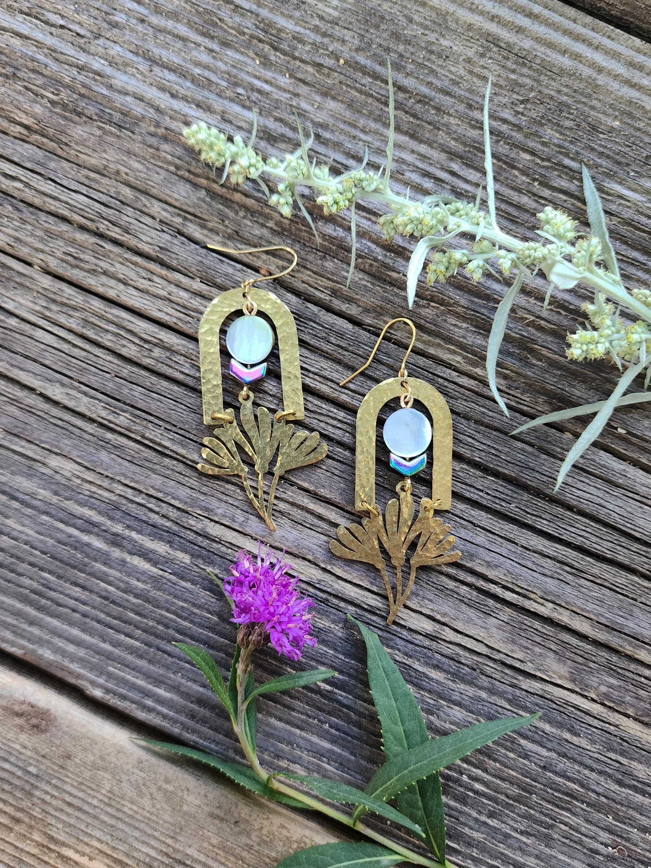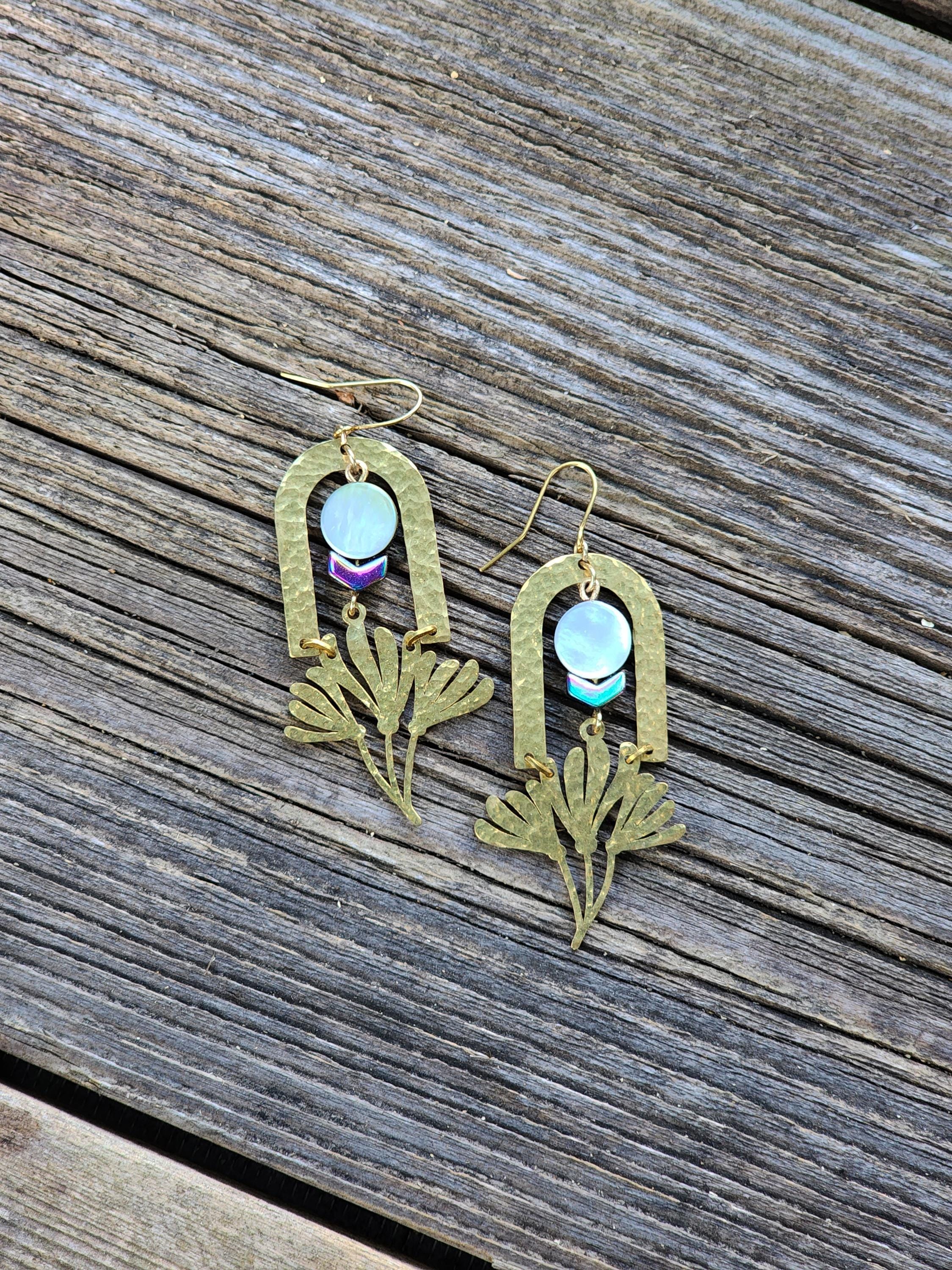 These earrings are designed and made by Ellie Bryan of Black Banjo Arts. These earrings are hammered by hand and assembled from brass components and natural abalone shell beads.