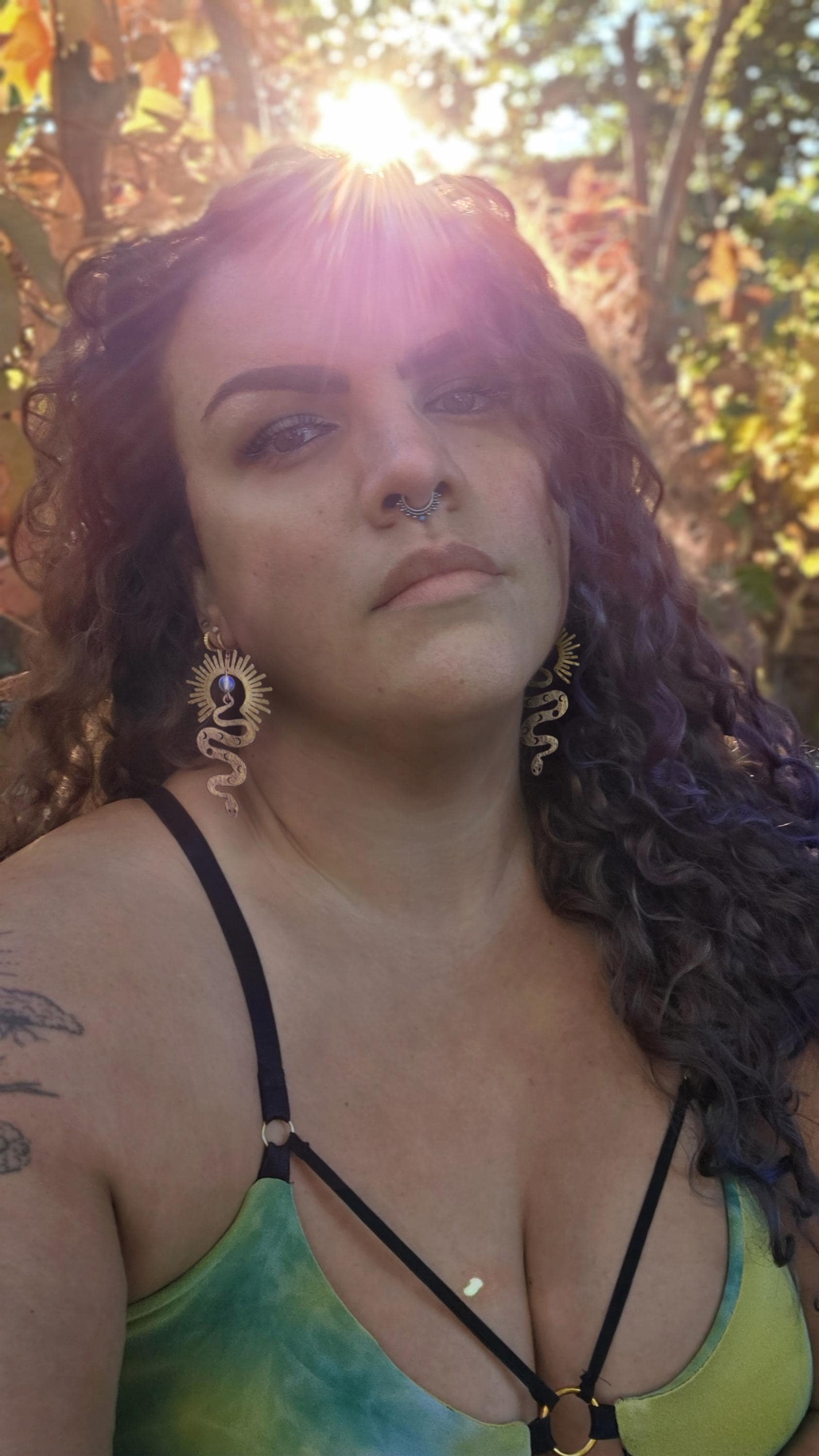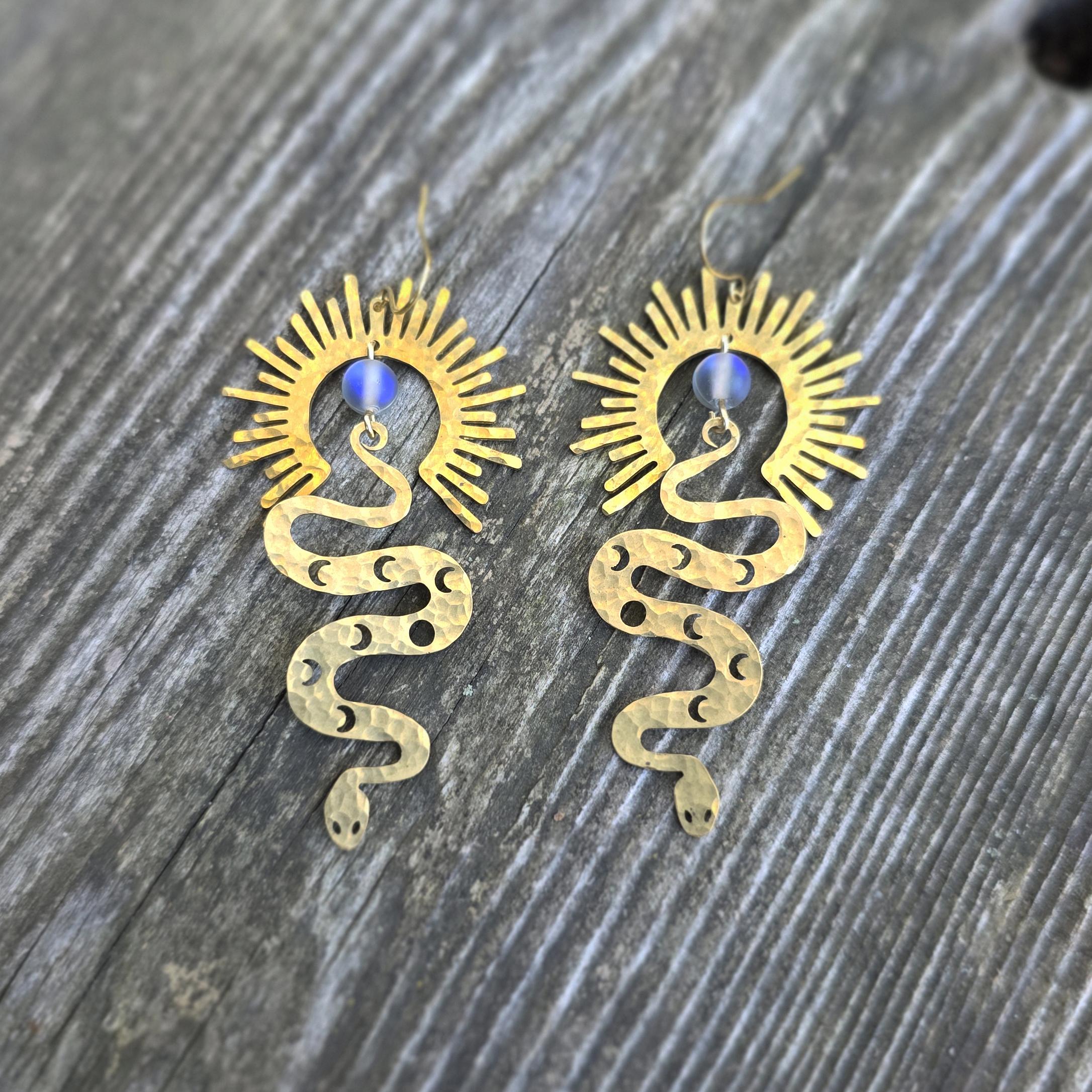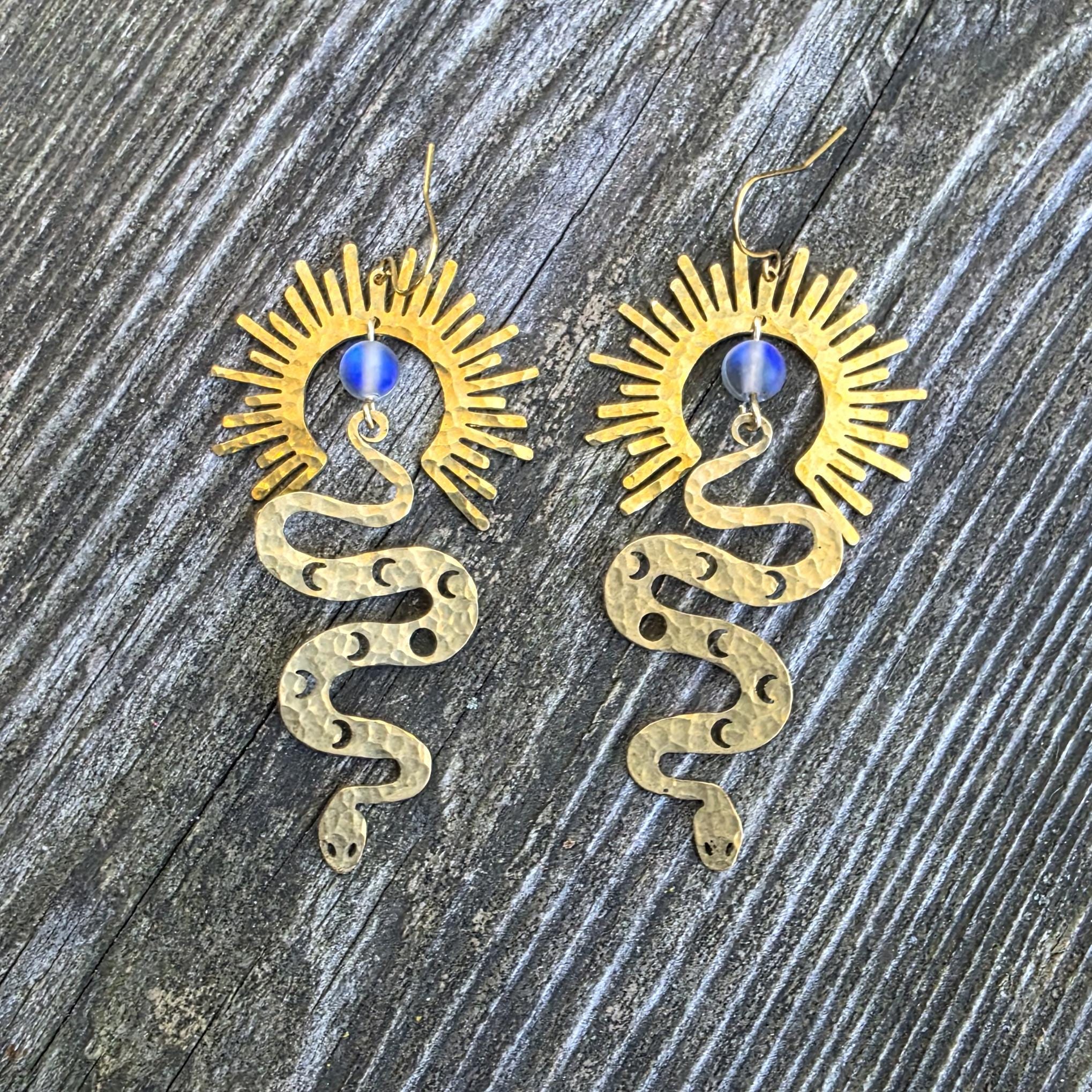 These earrings are designed and made by Ellie Bryan of Black Banjo Arts. These earrings are hammered by hand and assembled from brass components and glass beads.