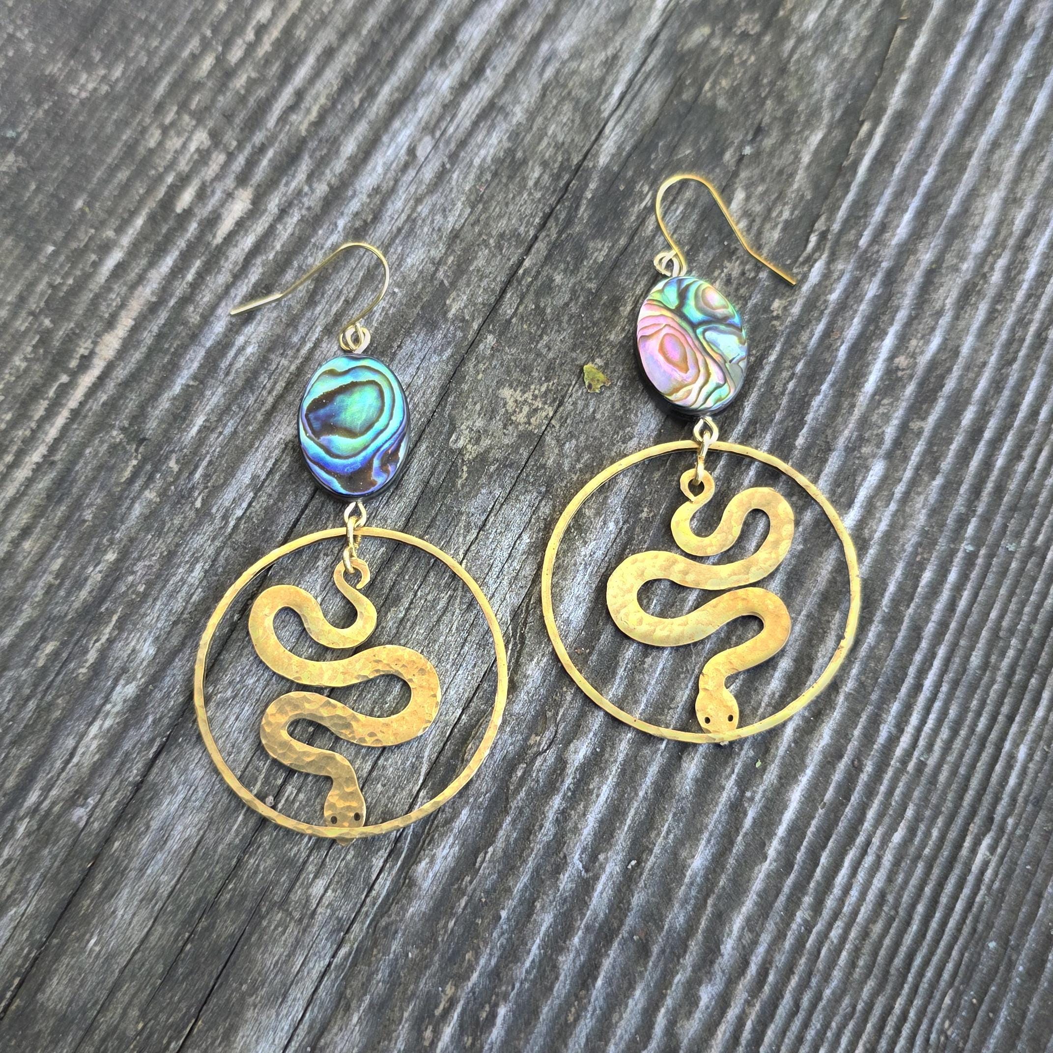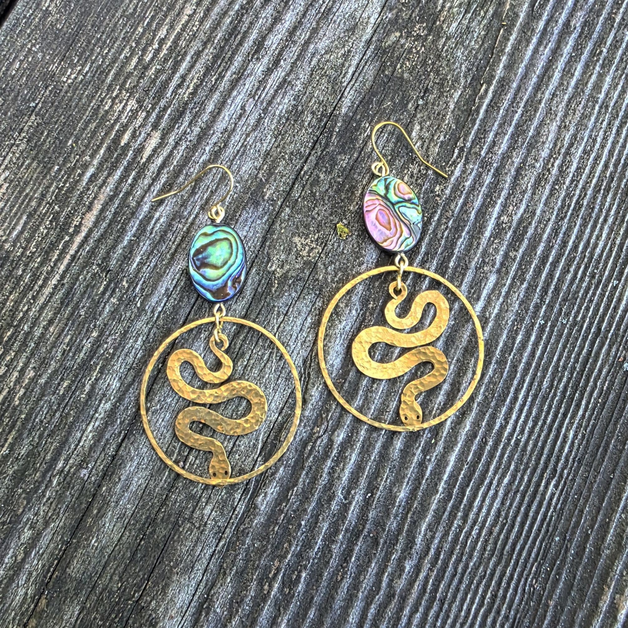 These earrings are designed and made by Ellie Bryan of Black Banjo Arts. These earrings are hammered by hand and assembled from brass components and natural abalone shell beads.