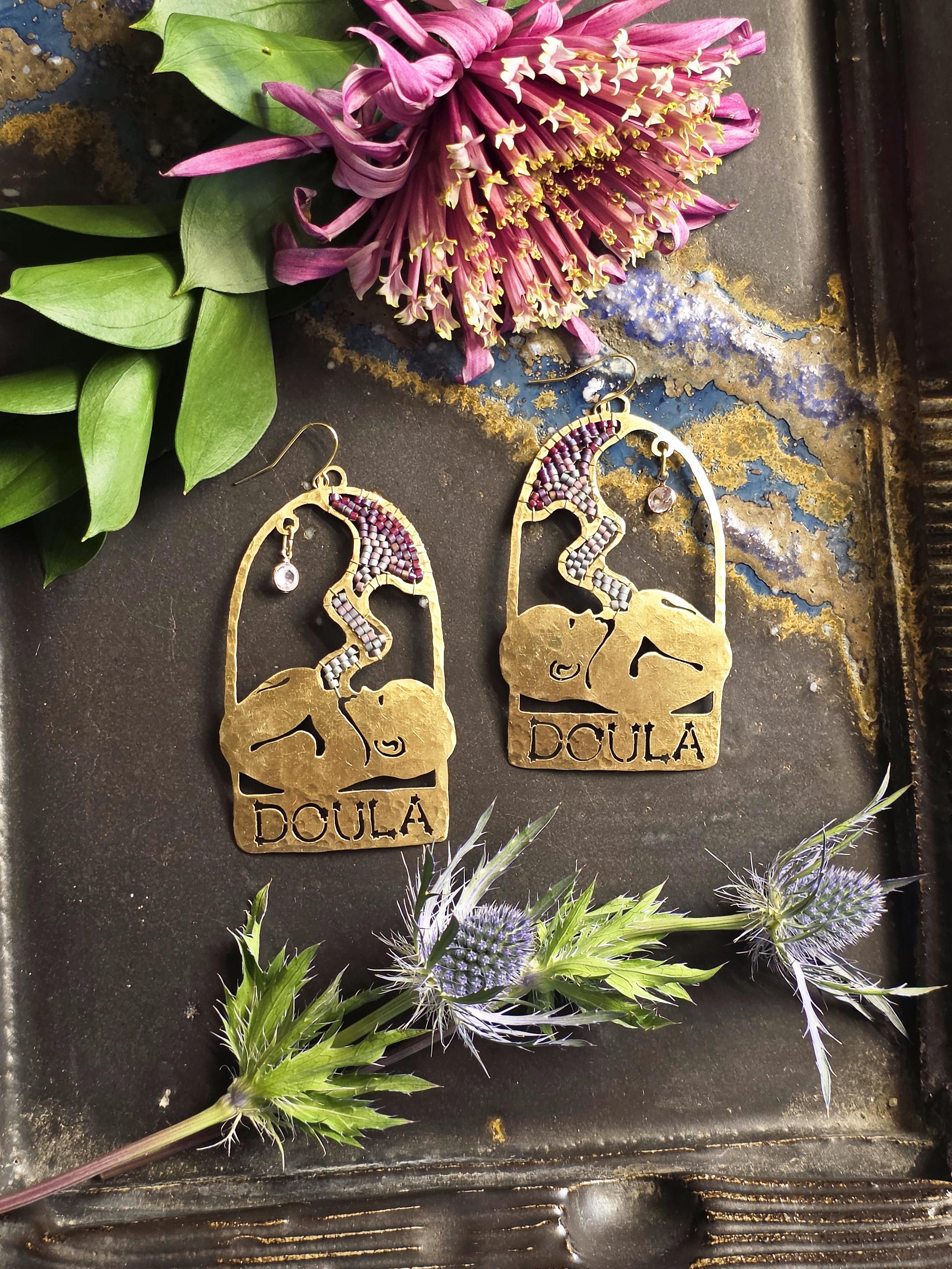 Celebrate birthwork with these one-of-a-kind Doula statement earrings, an original design by Ellie Bryan. Thoughtfully crafted to honor the beauty of the womb, this pair features a fetus being nourished by a hand-beaded placenta and umblical cord, underneath a sparkling cubic zirconia charm.