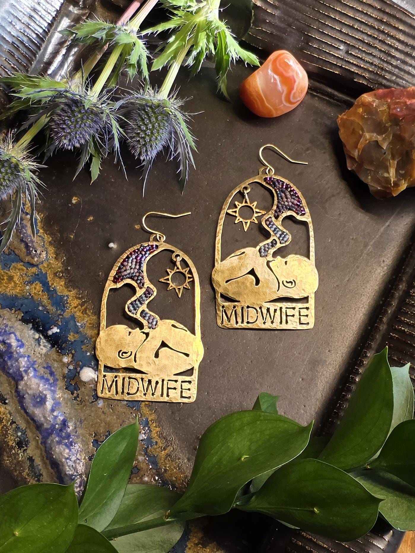 Celebrate birthwork with these one-of-a-kind Midwife statement earrings, an original design by Ellie Bryan. Thoughtfully crafted to honor the beauty of the womb, this pair features a fetus being nourished by a hand-beaded placenta and umblical cord, underneath a delicate brass sun charm.