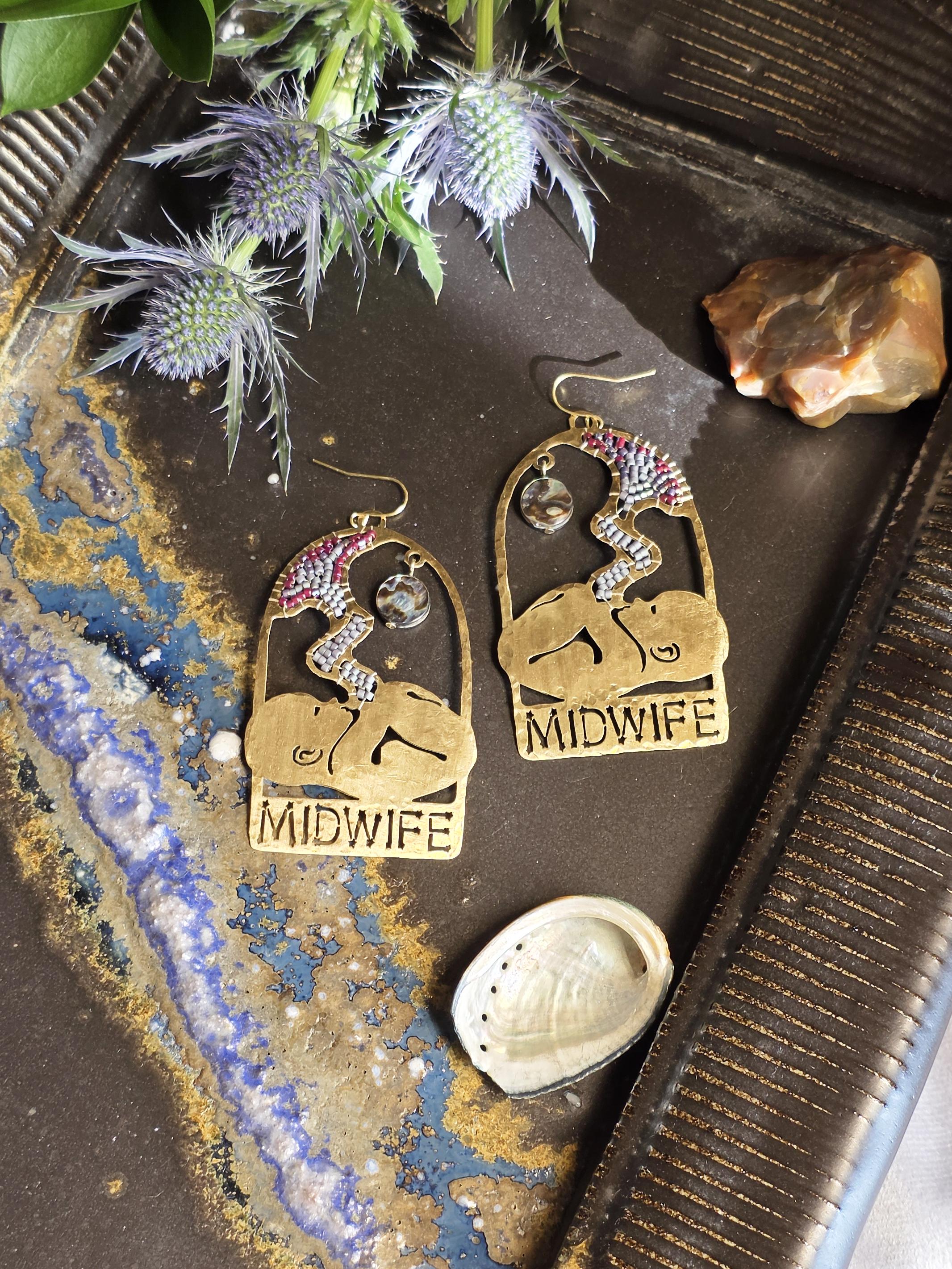 Celebrate birthwork with these Midwife statement earrings, an original design by Ellie Bryan. Thoughtfully crafted to honor the beauty of the womb, this pair features a fetus being nourished by a hand-beaded placenta and umblical cord, underneath an abalone shell moon.