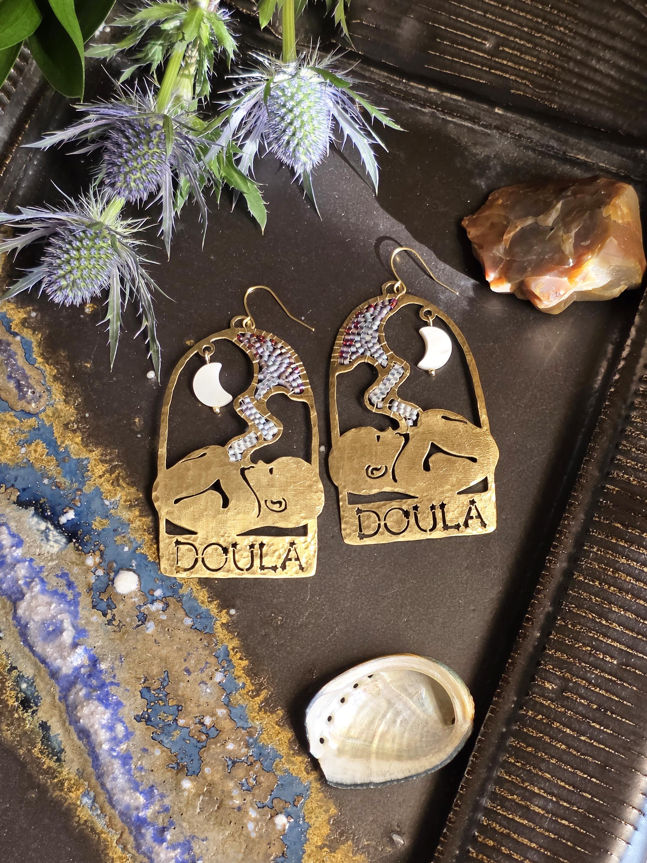 Celebrate birthwork with these one-of-a-kind Doula statement earrings, an original design by Ellie Bryan. Thoughtfully crafted to honor the beauty of the womb, this pair features a fetus being nourished by a hand-beaded placenta and umblical cord, underneath a natural shell crescent moon.