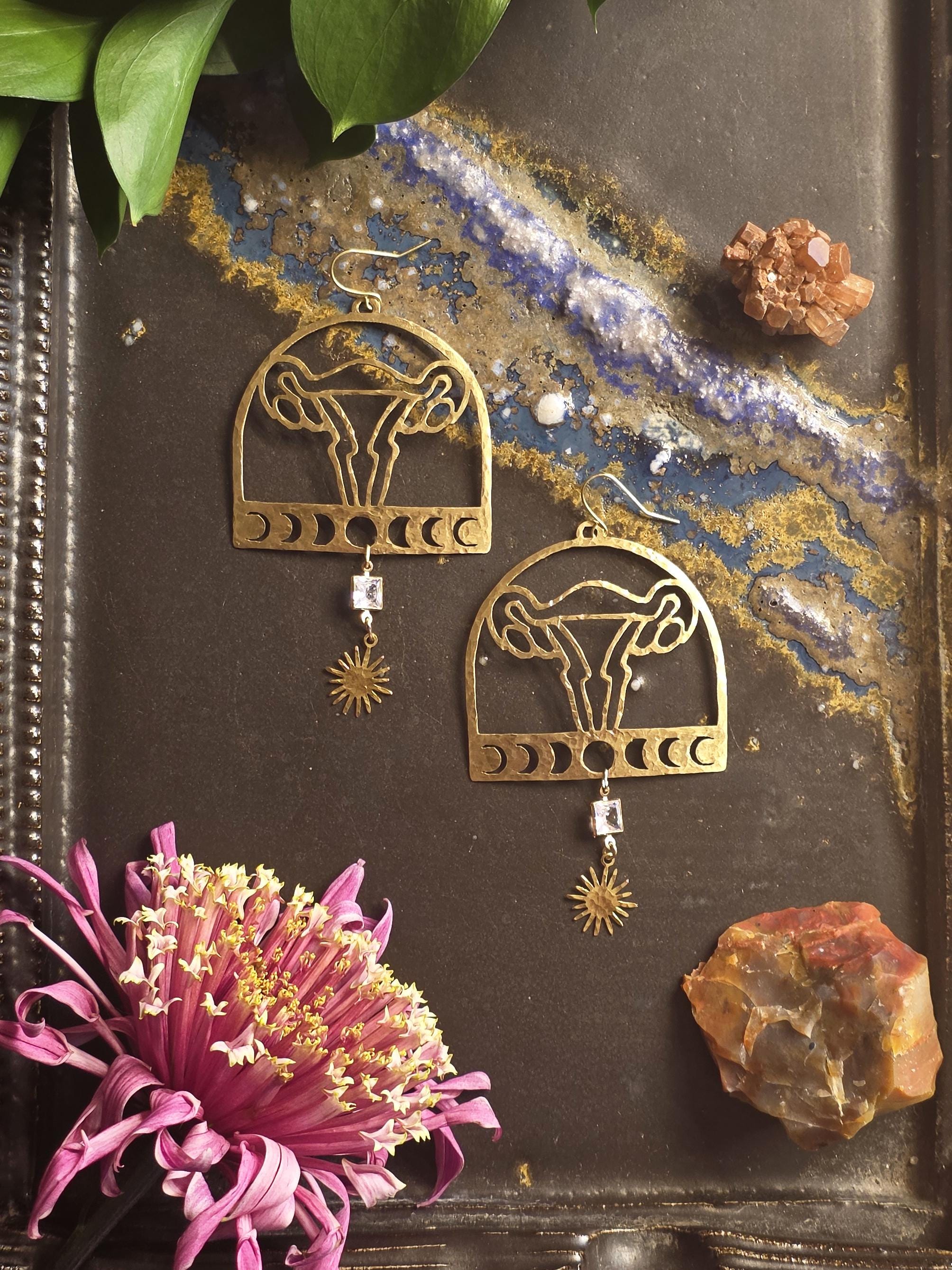 Celebrate this magic of the uterus with these one-of-a-kind Uterus Moon Phase statement earrings, an original design by Ellie Bryan.