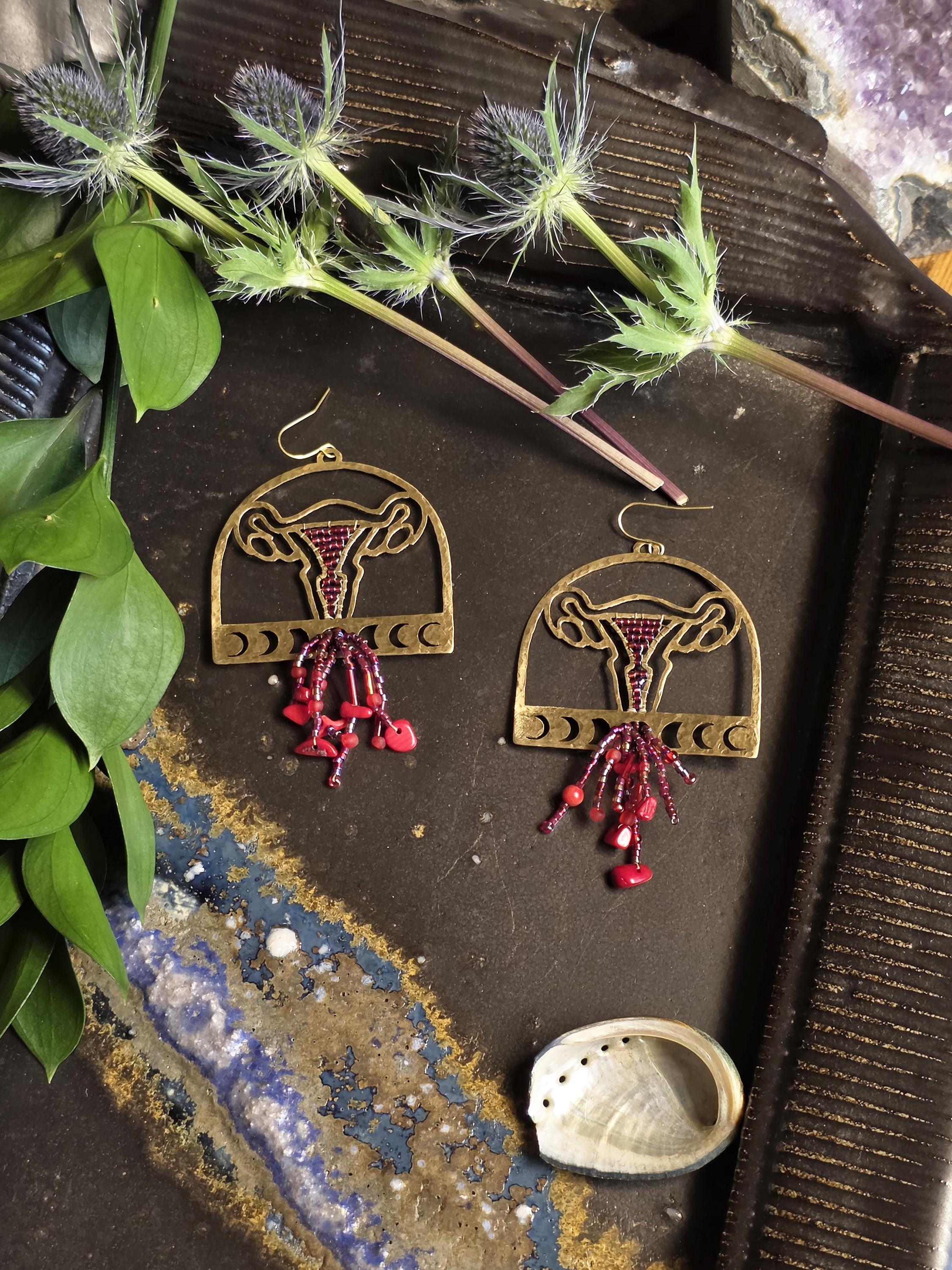 Menstruation and periods are the centerpiece of these one-of-a-kind Uterus Moon Phase statement earrings, an original design by Ellie Bryan.