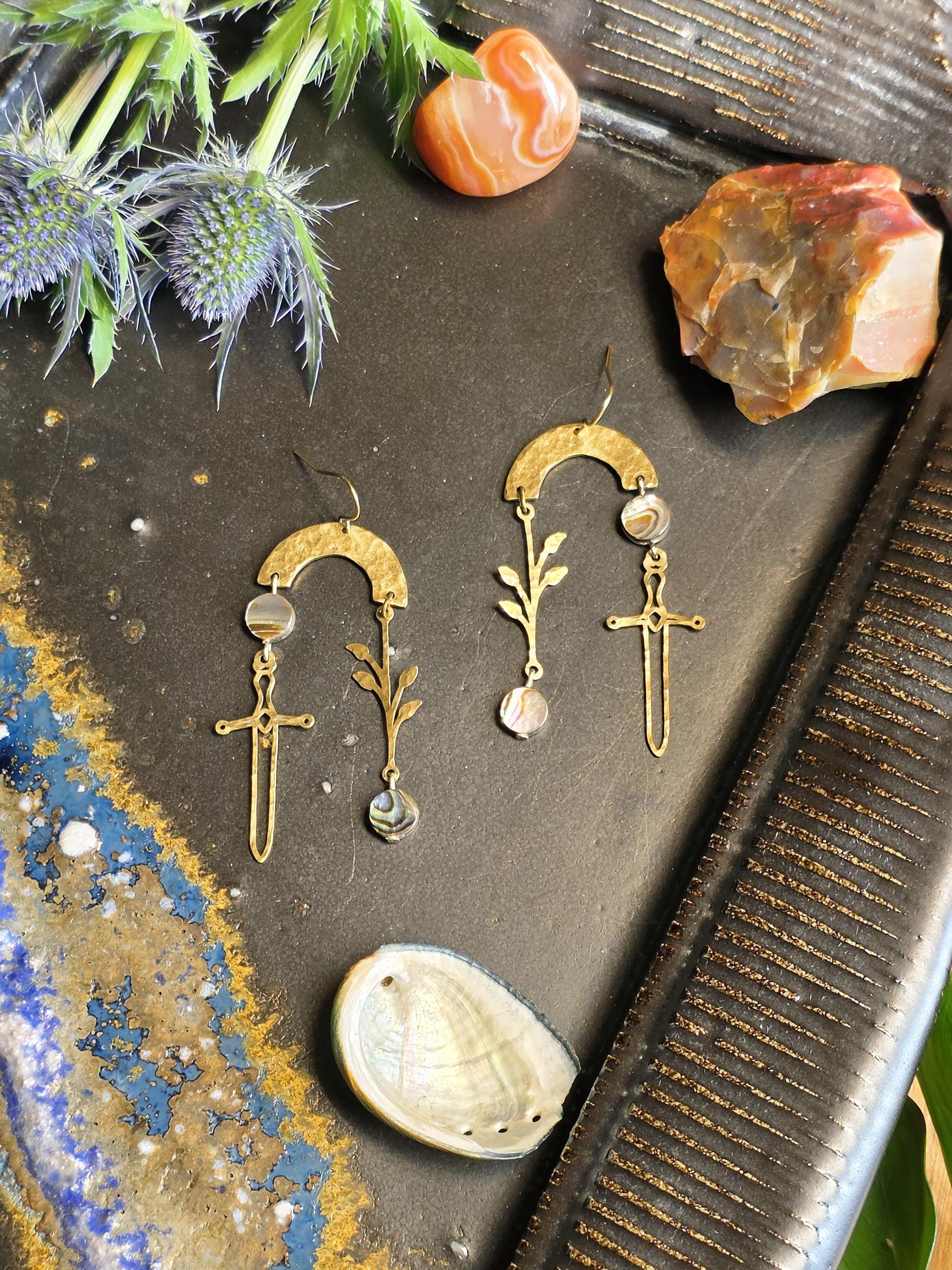 These earrings are designed and made by Ellie Bryan of Black Banjo Arts. These earrings are hammered by hand and assembled from brass components and natural abalone shell beads.