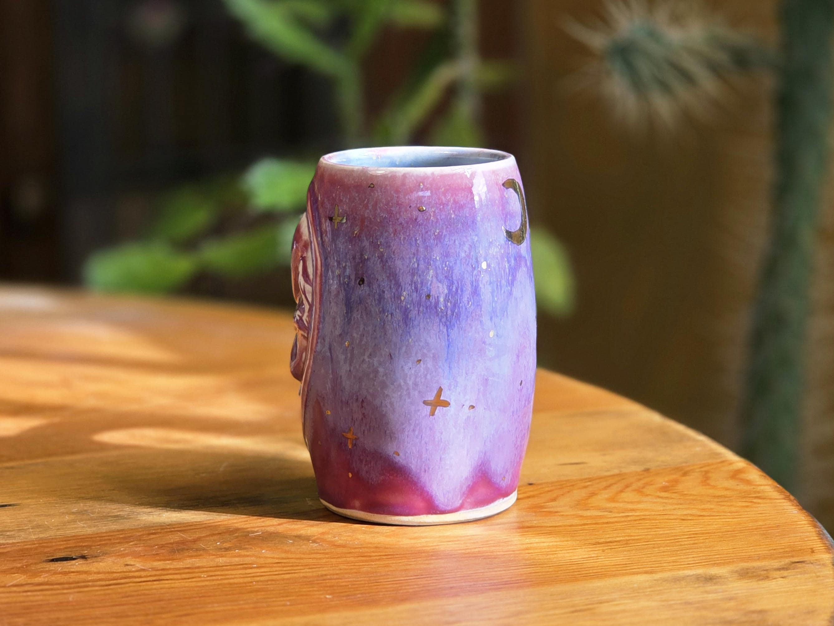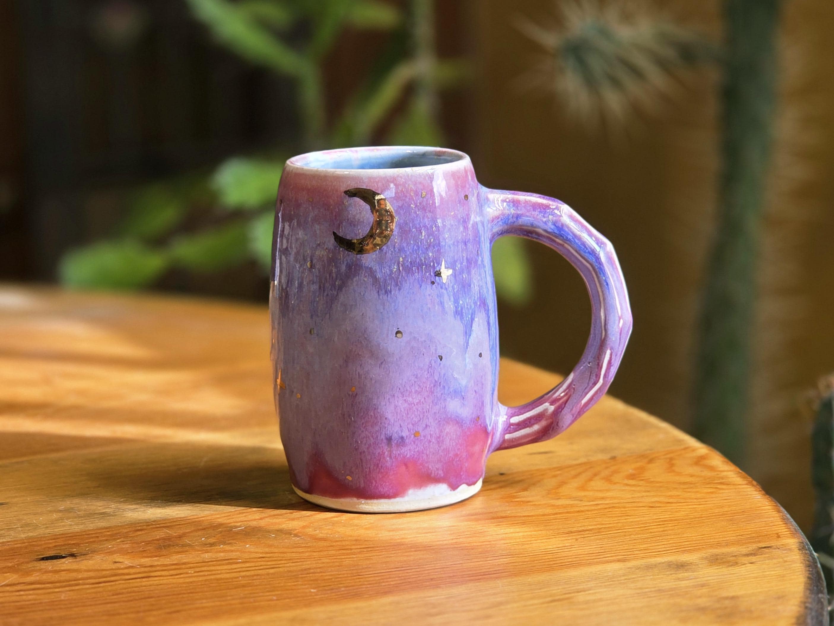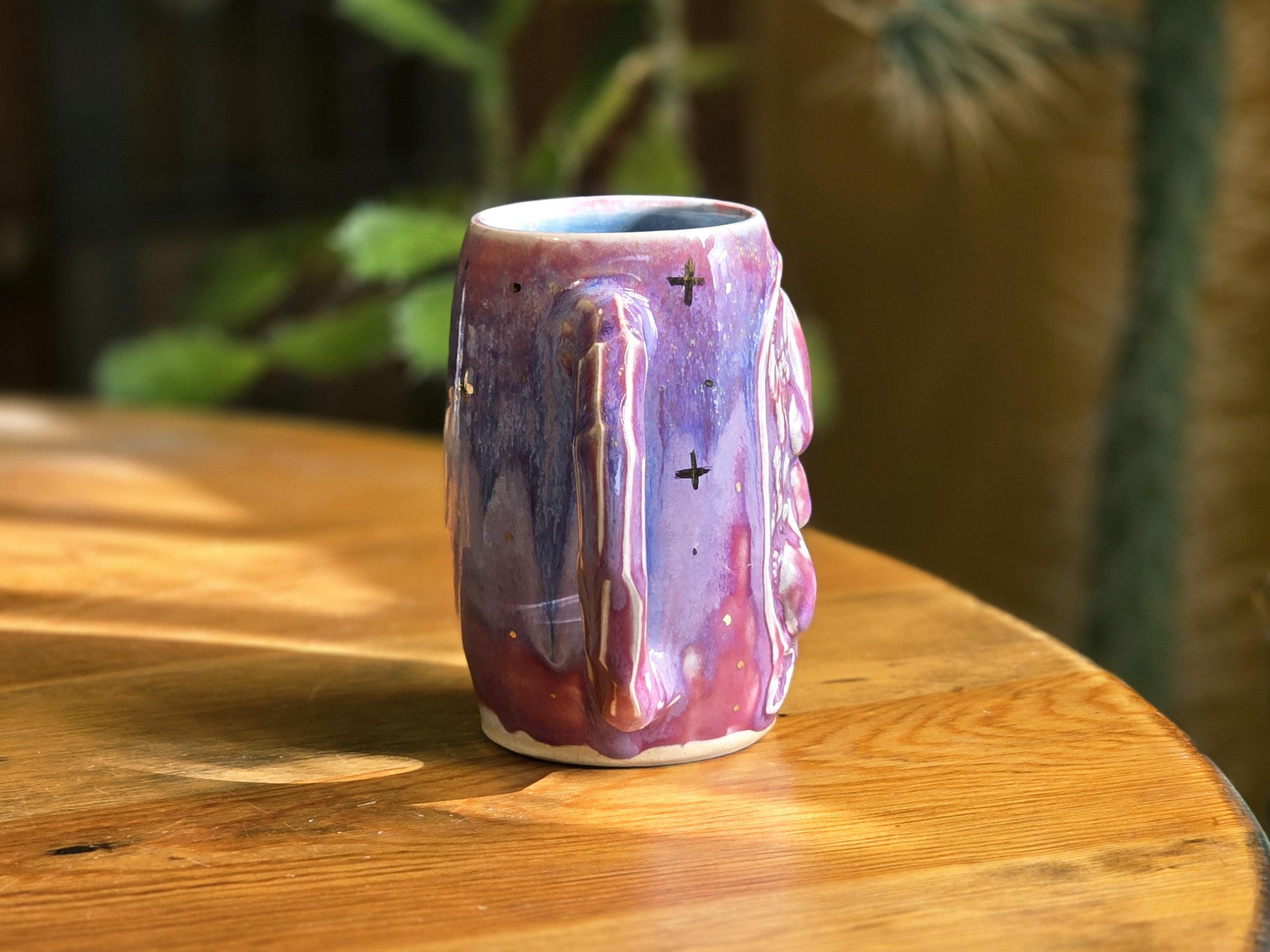 This mug has a shifting pink and purple glaze with crystals affixed to the side and real gold luster which created a sparkling celestial effect.