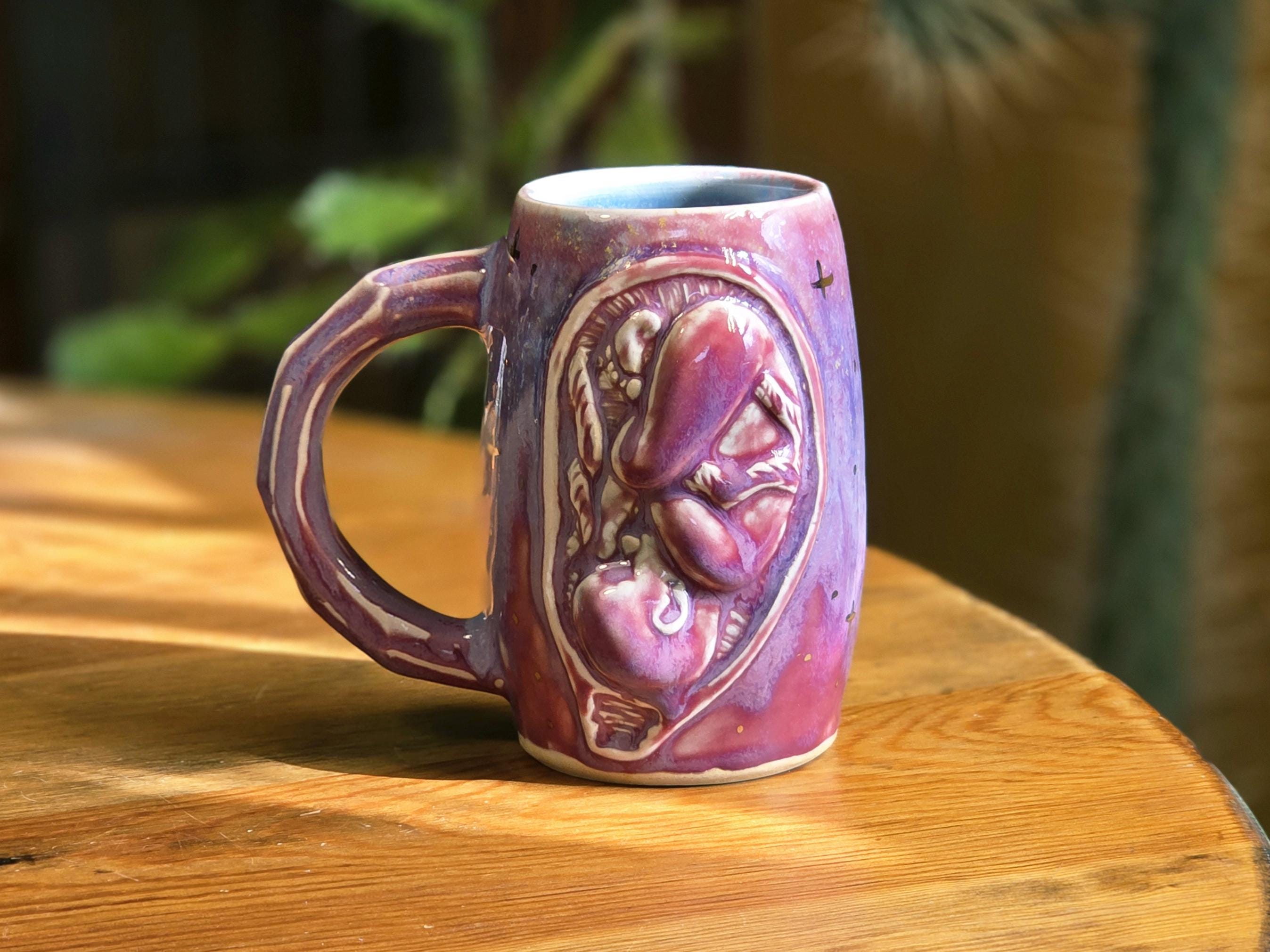 This one-of-a-kind porcelain mug features a sculptural form of the fetus in utero, which was hand-carved by artist Ellie Bryan of Black Banjo Arts, making it bespoke and one of a kind.
