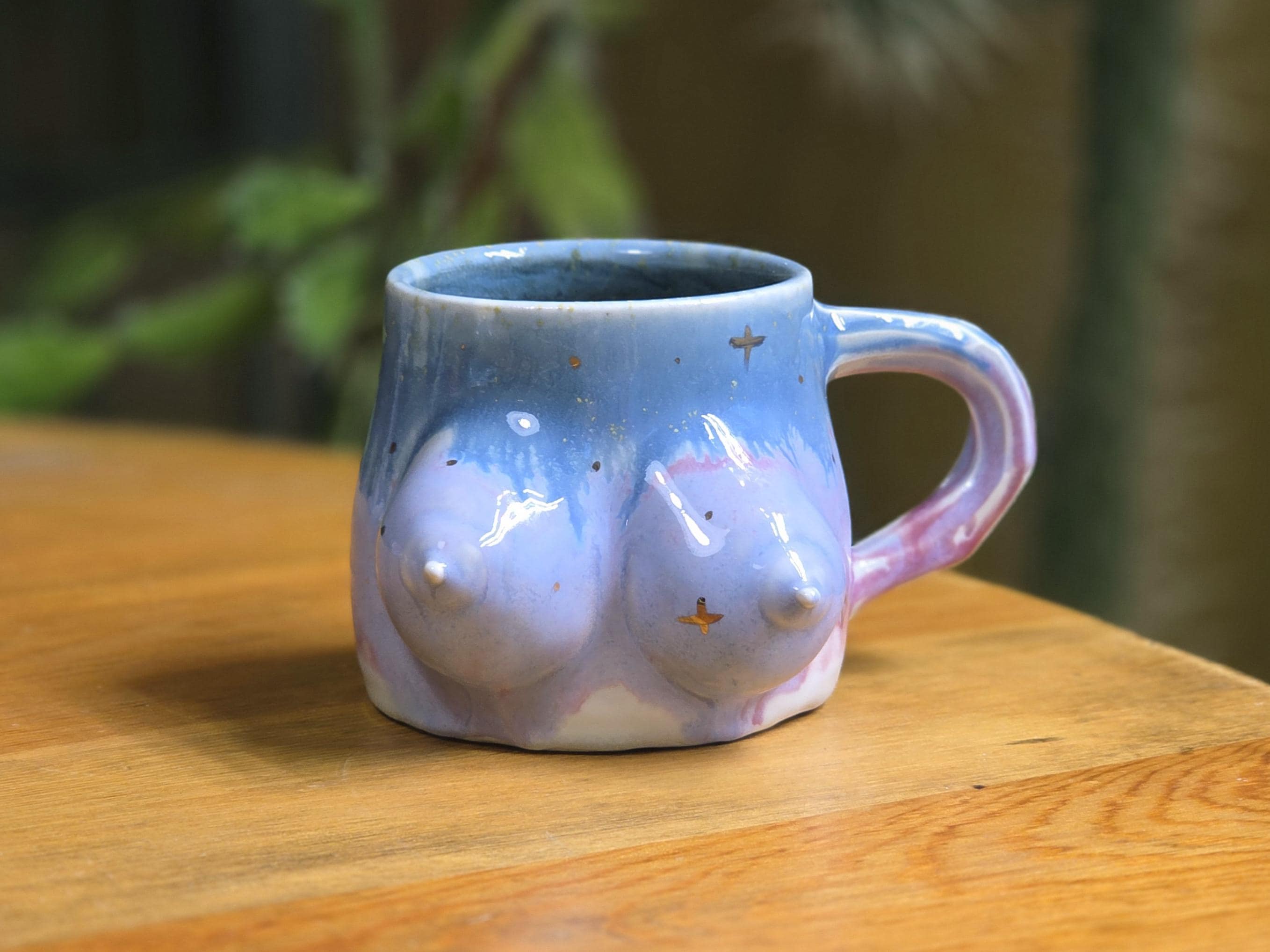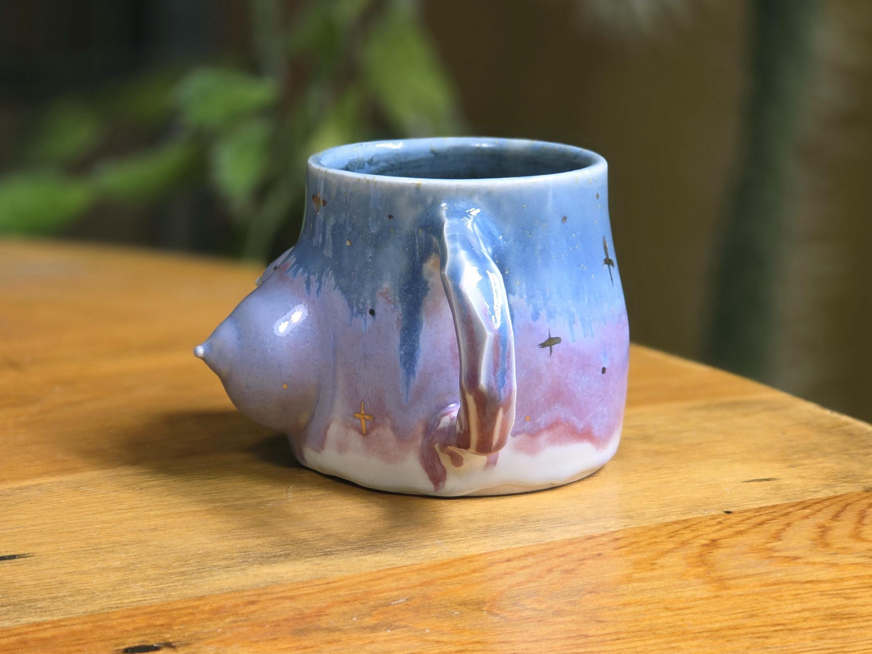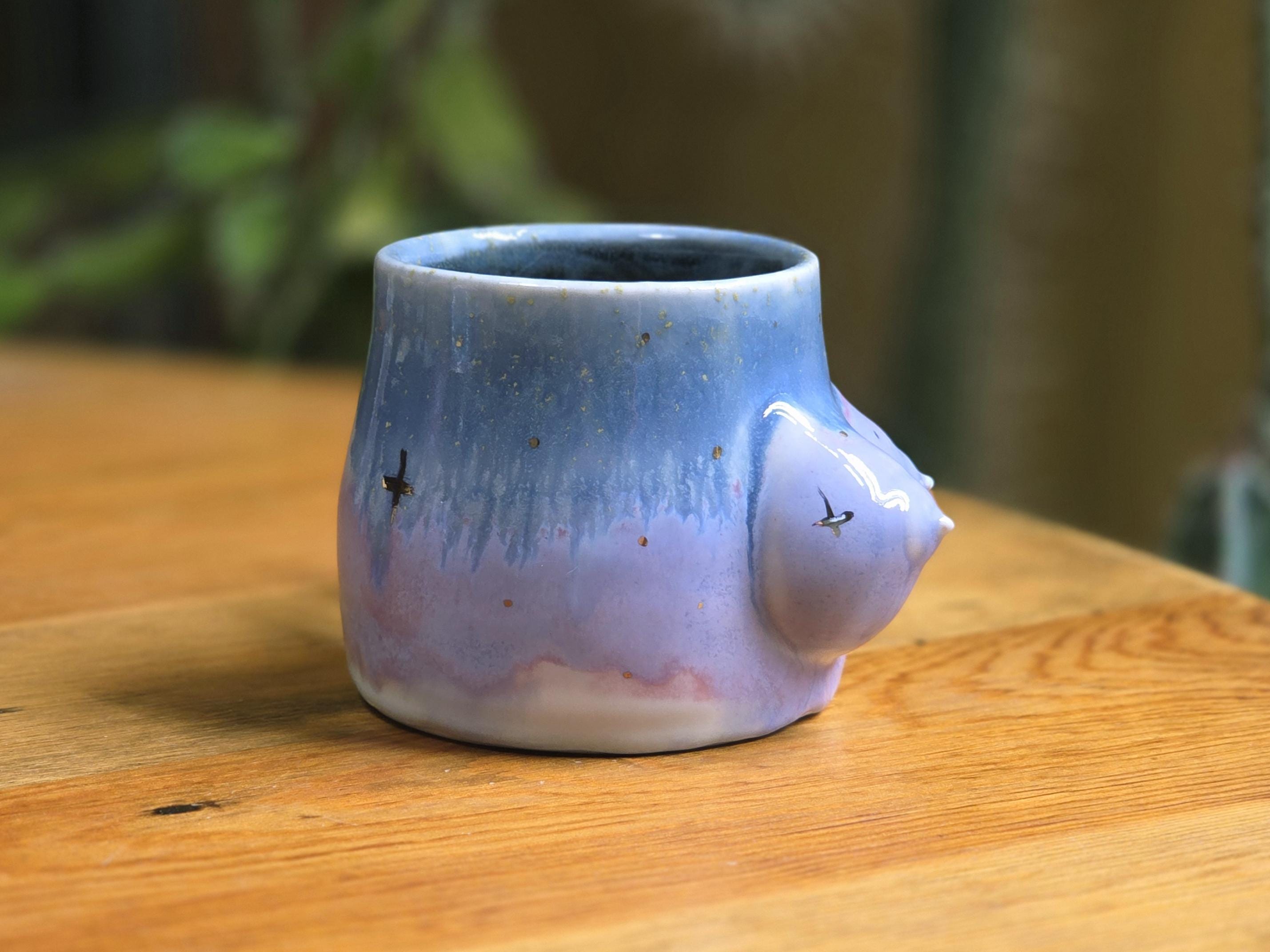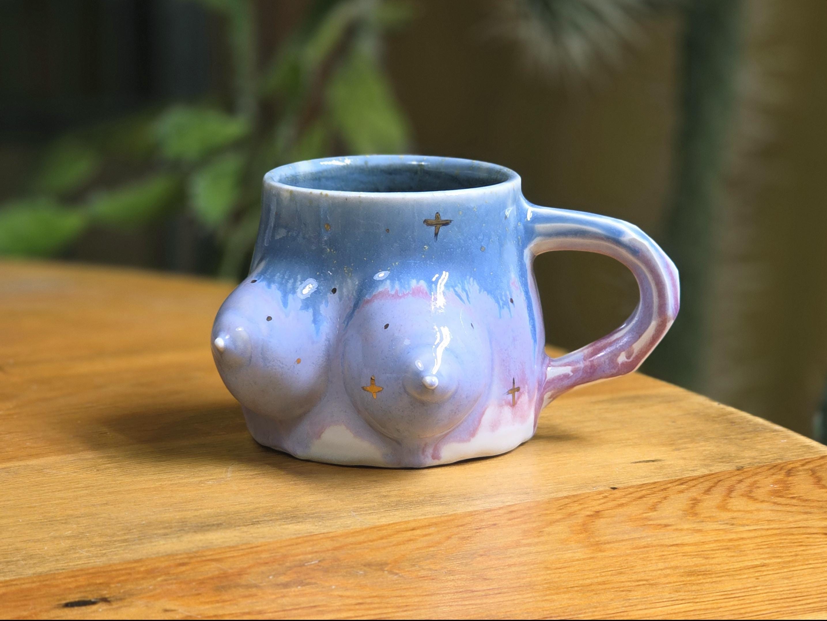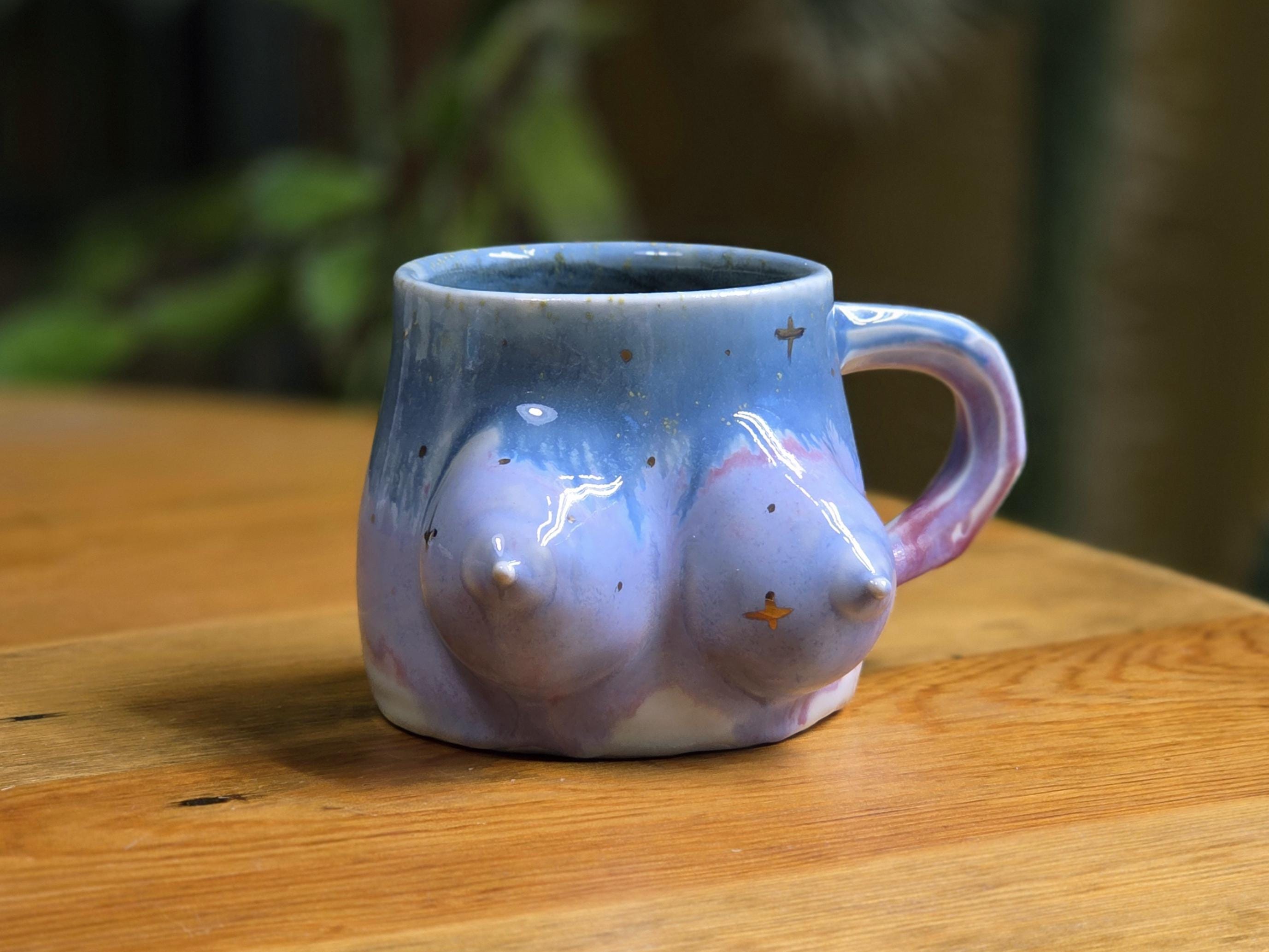 This one-of-a-kind porcelain mug features hand sculpted breasts by artist Ellie Bryan of Black Banjo Arts. Ellie is commited to creating unique and inclusive boob mugs, each one is absolutely as individualized as breasts are in real life.