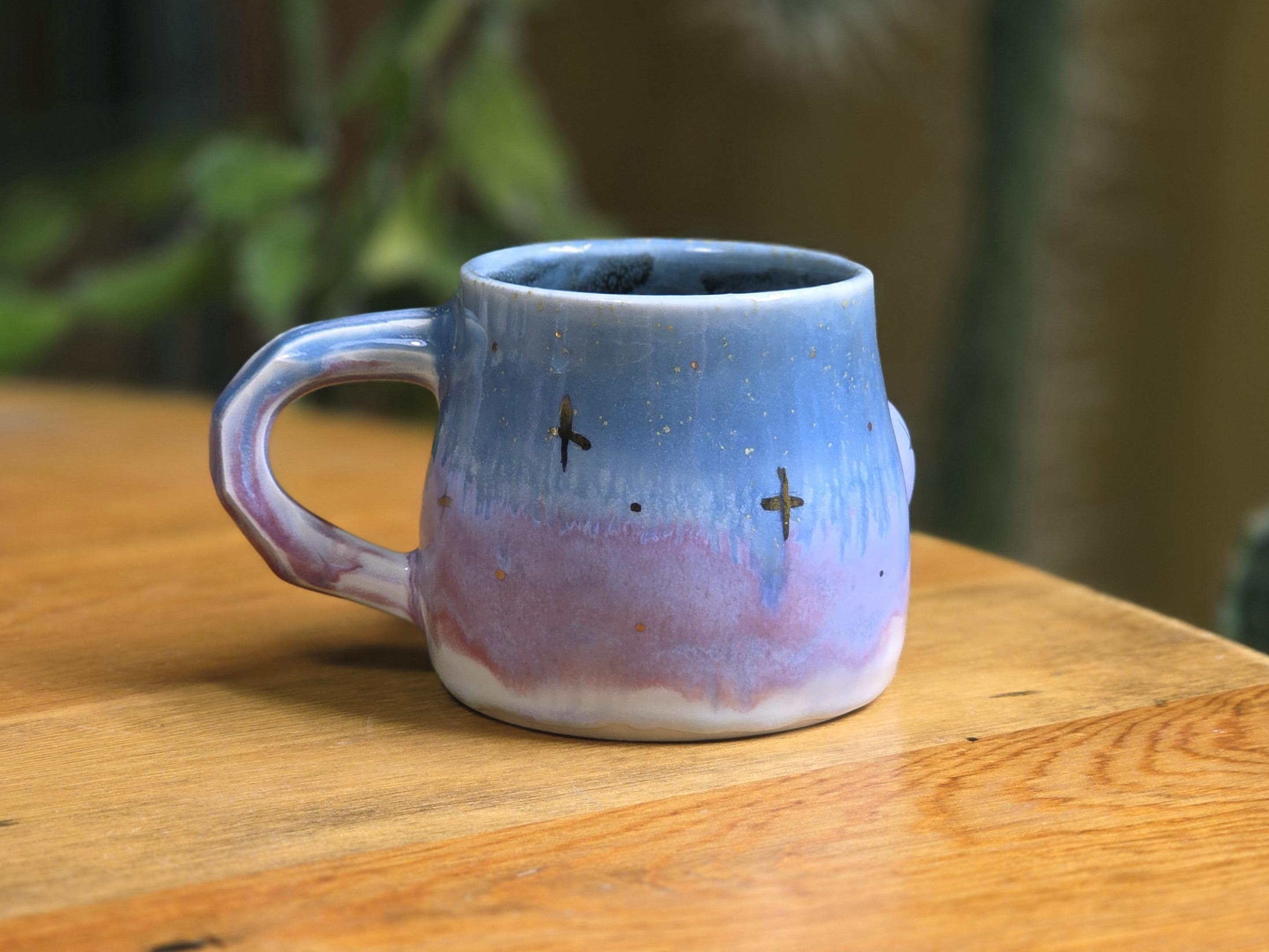 This mug has a shifting blue and pink glaze.