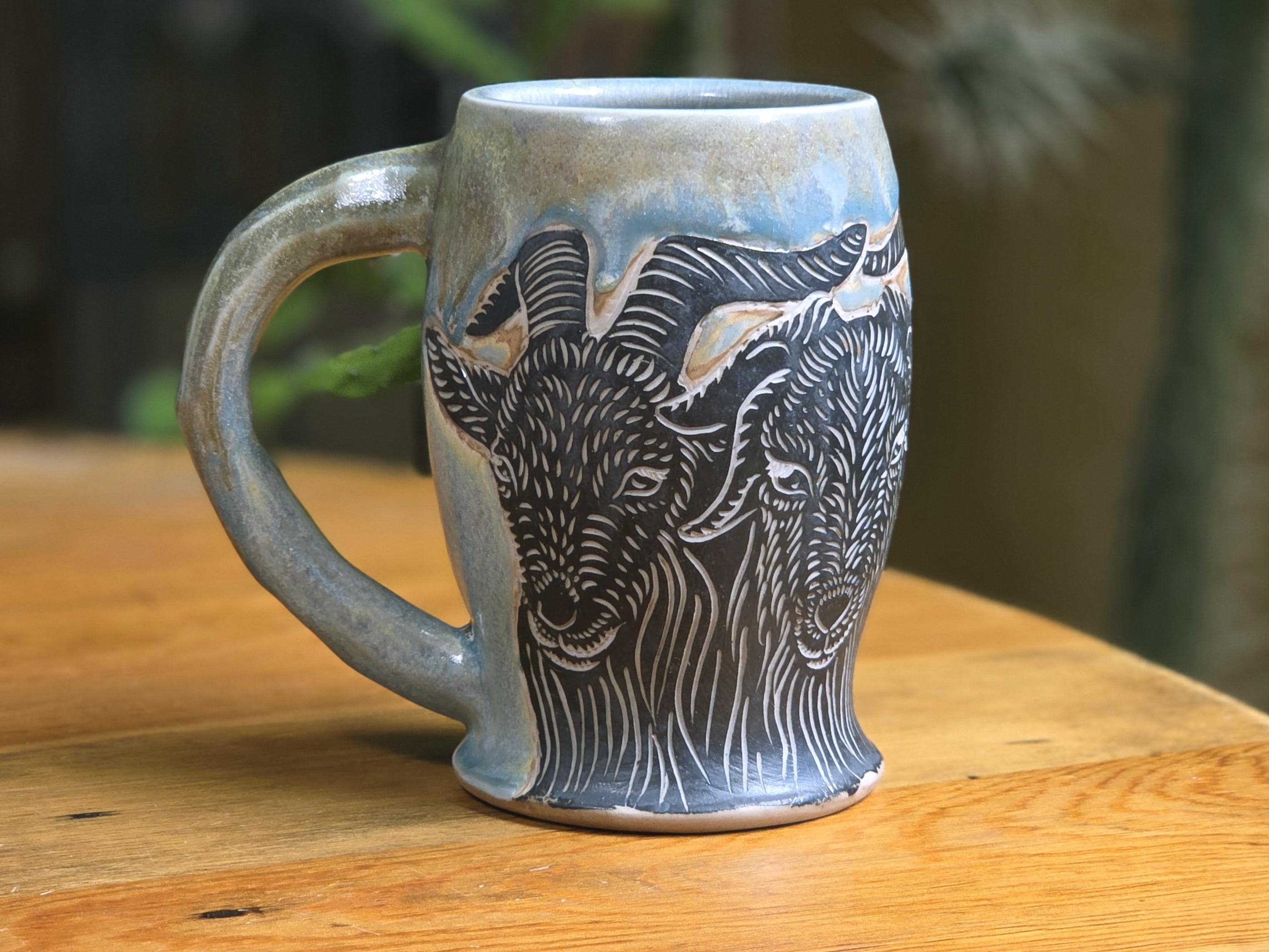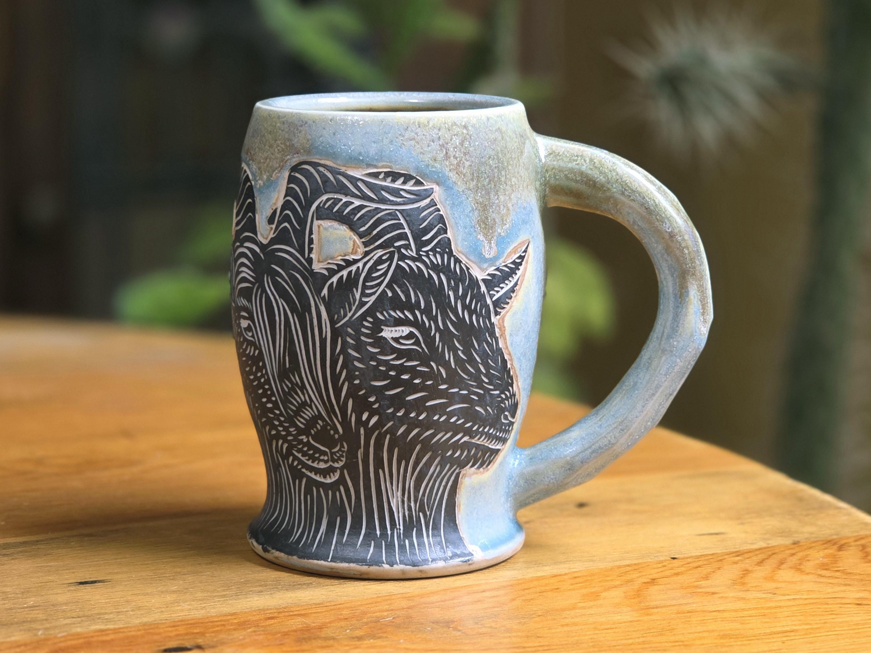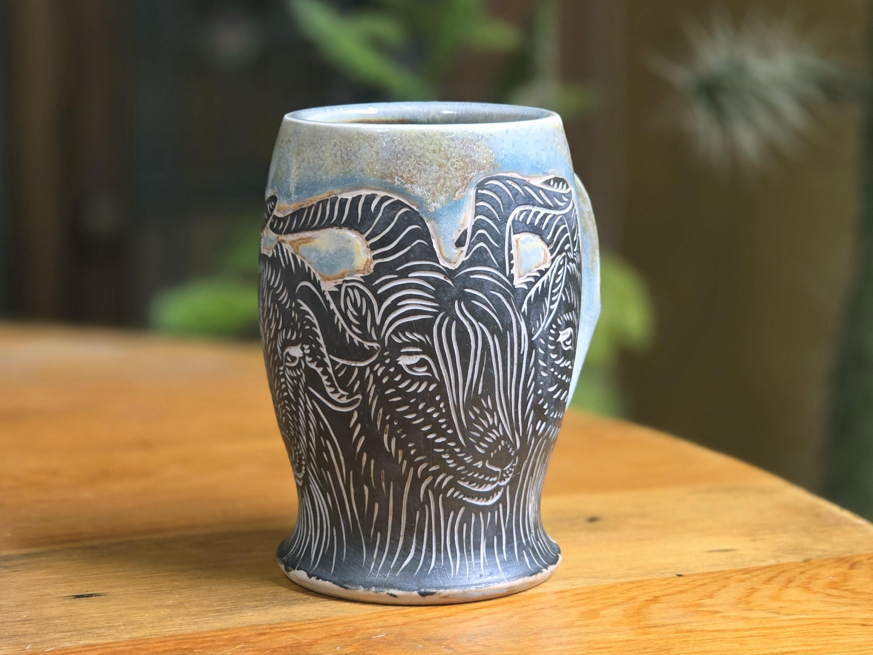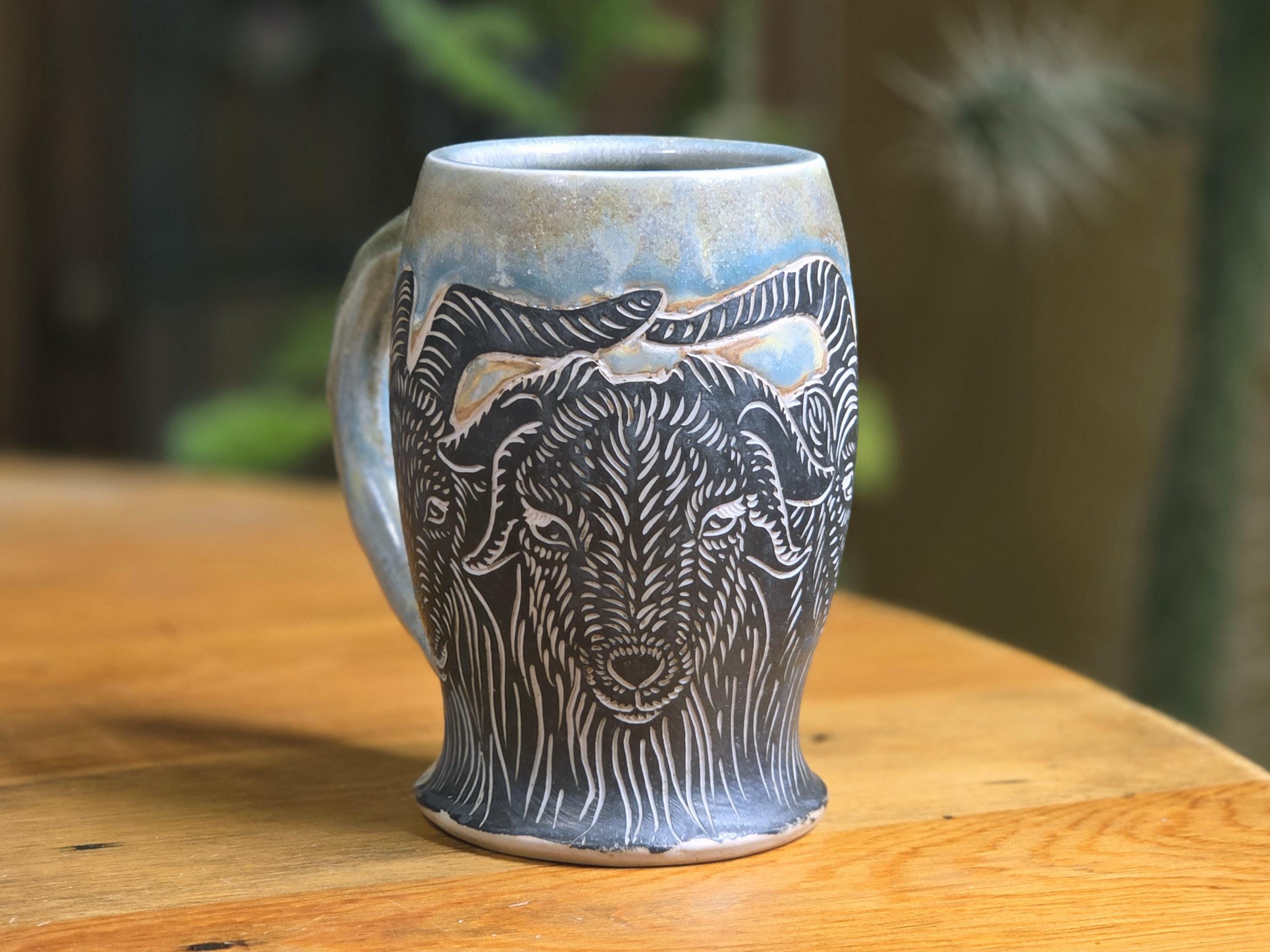 This is a one of a kind Black Banjo Arts mug featuring four Goats and real gold luster. This piece is hand-drawn by artist Ellie Bryan using the sgraffito technique on porcelain and fired to cone 10 gas reduction in Minneapolis, MN.